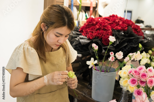 Young Asian woman arranging flowers in a flower shop during the afternoon