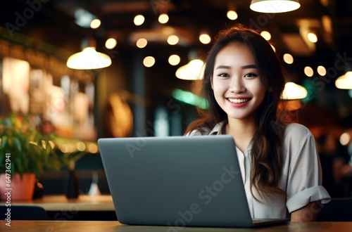Young asian woman, digital nomad working remotely from a cafe, drinking coffee and using laptop, smiling. AI Generated
