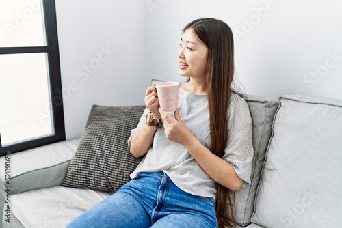 Young asian woman drinking cup of coffee sitting on the sofa at the living room