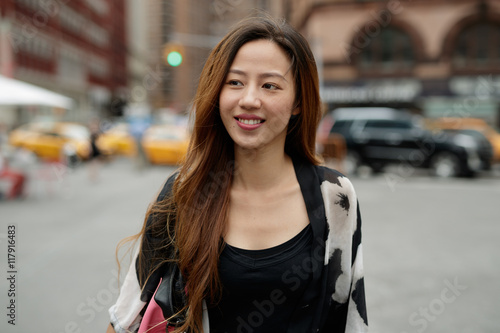Young Asian woman in city walking smile happy face