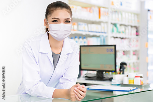 Young Asian woman pharmacist in white gown coat wearing medical face mask at the counter in pharmacy