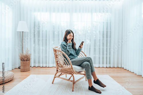 Young Asian Woman Relaxing in Modern Wicker Chair Near Window with Sheer Curtain, Happy Female Using Mobile Smartphone Enjoying at Home, Comfort and Cozy