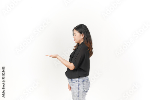 Young Asian woman showing product on open palm copy space wearing Black t-shirt and jeans isolated on white background