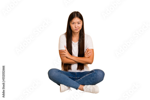 Young asian woman sitting on the floor cutout isolated frowning face in displeasure, keeps arms folded.
