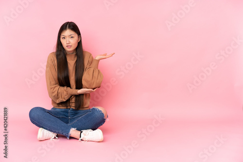 Young asian woman sitting on the floor isolated on pink background unhappy for not understand something