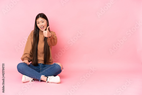 Young asian woman sitting on the floor isolated on pink background with thumbs up because something good has happened