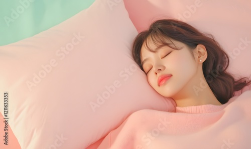 Young Asian Woman Sleeping in Pastel Colored Bedroom, Generative AI
