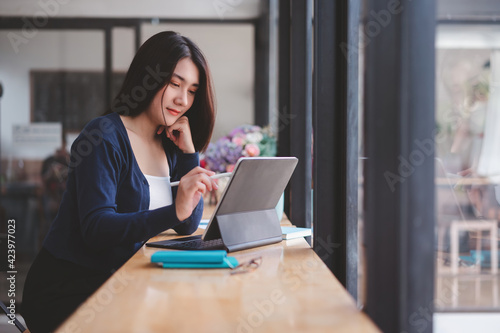 Young asian woman thinking about new ideas during working on laptop computer at cafe.