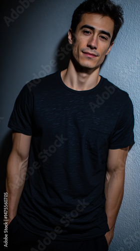 Young Athlete Portrait Energetic Man Casual Style Handsome Fitness Posing Relaxed Smile Fashion Indoors Charismatic Look Dynamic Professional Lighting Individuality Height Personality