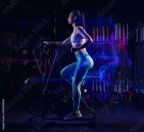Young athletic woman wearing sports uniform and sneakers going in for sports, fitness training in modern gym. Dark background with mixed neon light