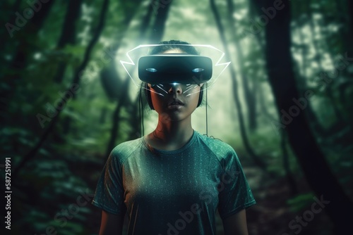 Young athletic woman wearing VR headset, practising yoga and meditation in futuristic Way. Her consciousness is transformed into beautiful and peaceful forest