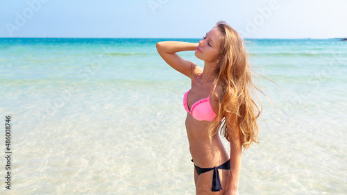 Young attractive blonde girl with perfect sport body in bikini on the tropical summer beach