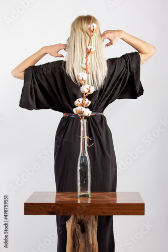 Young Attractive blonde woman in a black trendy and fashionable kimono