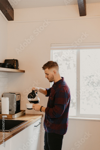 Young Attractive Minimalist Hipster Man in Modern Designed Kitchen Brews, Pours, and Drinks Morning Coffee out of a Cup