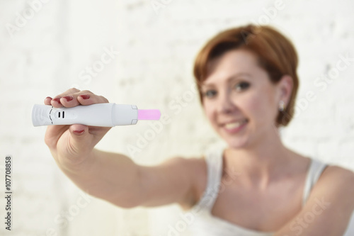 young attractive pregnant woman holding happy positive result pregnancy test sitting on bed