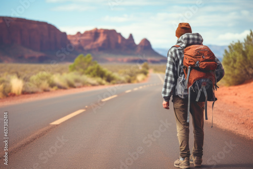 Young backpacker hitchhiking road in Sedona canyon on a sunny day. Auto stop adventure, backpack concept.