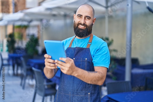 Young bald man waiter smiling confident using touchpad at coffee shop terrace