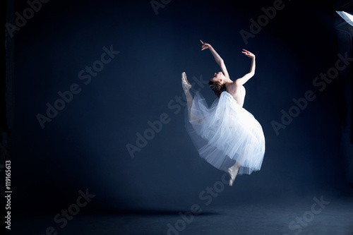 Young ballerina in a beautiful dress is dancing in a dark photostudio