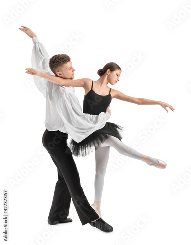 Young ballet dancers on white background
