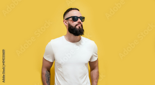 Young bearded hipster guy wearing white blank t-shirt. Studio shot on yellow background. Mock-up for print. T-shirt template.