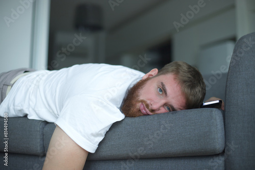 Young bearded man sleep at home on couch with his cell mobile phone in living room. Smartphone addiction concept.