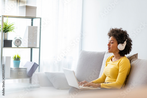 Young beautiful african american woman relaxing and listening to music using headphones. Smiling young woman watching a video with her laptop while siting on a sofa