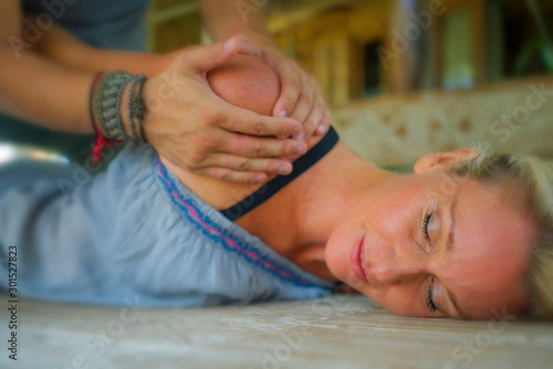young beautiful and happy American tourist woman having traditional Thai massage in her body by Asian masseur at outdoors spa enjoying holidays retreat