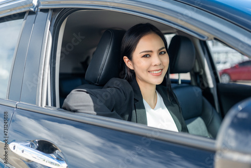 Young beautiful asian business women in suit getting new car. She very happy and excited. Smiling female driving vehicle on the road on a bright day.