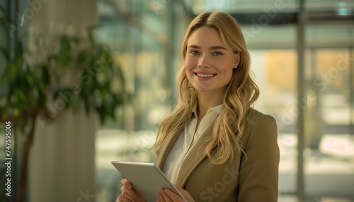 Young beautiful blond caucasian business woman or CEO executive manageer standing in light office with glass walls holding tablet and smiling at camera