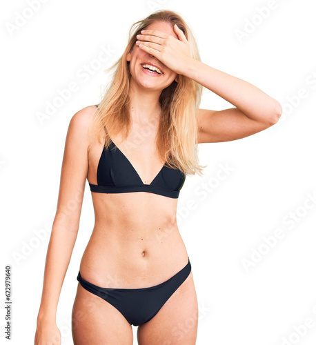 Young beautiful blonde woman wearing bikini smiling and laughing with hand on face covering eyes for surprise. blind concept.