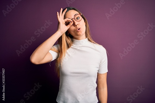 Young beautiful blonde woman with blue eyes wearing casual t-shirt over purple background doing ok gesture shocked with surprised face, eye looking through fingers. Unbelieving expression.