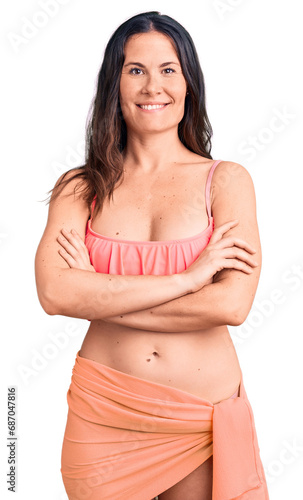 Young beautiful brunette woman wearing bikini happy face smiling with crossed arms looking at the camera. positive person.