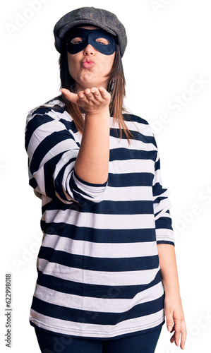 Young beautiful brunette woman wearing burglar mask looking at the camera blowing a kiss with hand on air being lovely and sexy. love expression.