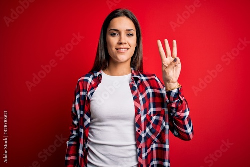Young beautiful brunette woman wearing casual shirt standing over isolated red background showing and pointing up with fingers number three while smiling confident and happy.