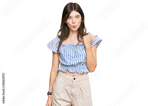 Young beautiful caucasian girl wearing casual clothes surprised pointing with hand finger to the side, open mouth amazed expression.