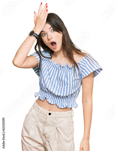 Young beautiful caucasian girl wearing casual clothes surprised with hand on head for mistake, remember error. forgot, bad memory concept.