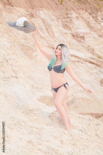 Young beautiful Caucasian woman in striped big hat with fashion swimwear posing in desert landscape with sand.