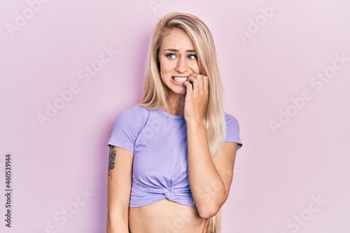 Young beautiful caucasian woman wearing casual t shirt looking stressed and nervous with hands on mouth biting nails. anxiety problem.
