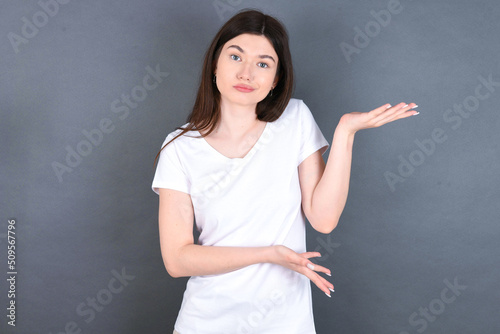 young beautiful Caucasian woman wearing white T-shirt over studio grey wall pointing aside with both hands showing something strange and saying: I don't know what is this. Advertisement concept.