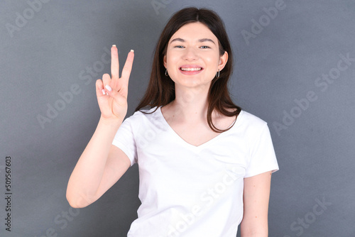 young beautiful Caucasian woman wearing white T-shirt over studio grey wall showing and pointing up with fingers number two while smiling confident and happy.