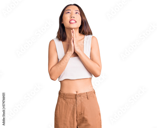 Young beautiful chinese girl wearing casual clothes begging and praying with hands together with hope expression on face very emotional and worried. begging.