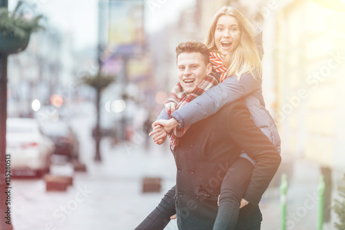 Young beautiful couple having fun in the winter on the street. Couple in love on Valentine's Day