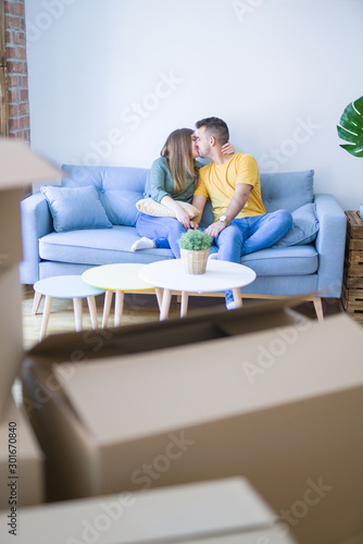 Young beautiful couple sitting and hugging on the sofa at new apartment with cardboard boxes around them, very excited for moving to a new home