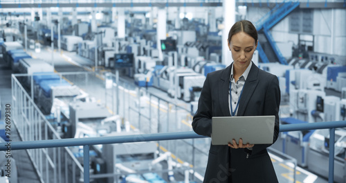 Young Beautiful Female Engineer Standing on a Platform, Using Laptop Computer at an Electronics Factory. Machines are Undergoing Maintenance, Technician Monitoring Updates Through Online Software