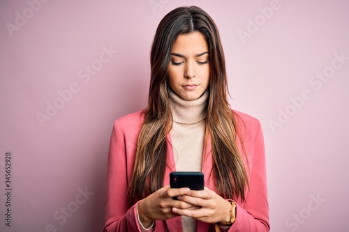 Young beautiful girl having conversation using smartphone over white background with a confident expression on smart face thinking serious
