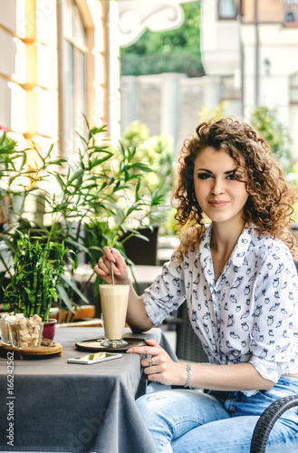 Young beautiful girl in a cafe. She stirs her latte and smiles.