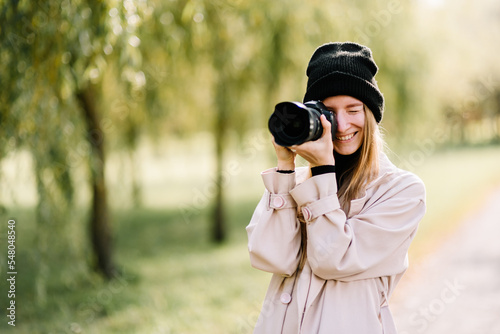 young beautiful girl is resting in nature with camera. woman photographer walking in the park on an autumn day