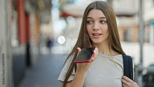 Young beautiful girl student wearing backpack sending voice message by smartphone at street