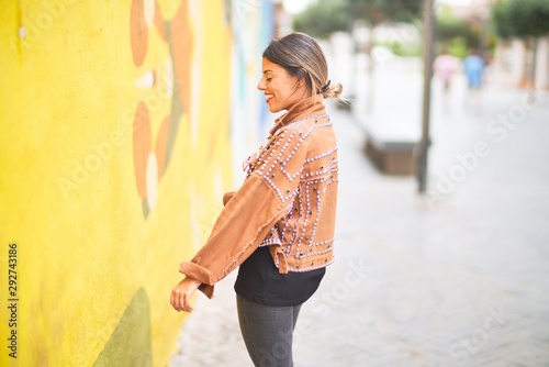 Young beautiful girl wearing brown jacket standing backwards over colorful wall at the town street
