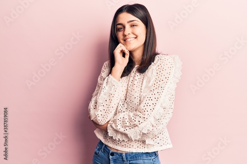Young beautiful girl wearing casual clothes smiling happy and confident. Standing with smile on face over isolated pink background